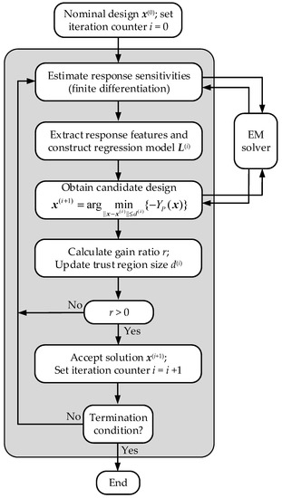 Understanding (and being able to quantify) how uncertainties affect the electrical characteristics, and the performance of circuits, is important, yet making the designs immune to tolerances is even more crucial. Increasing the likelihood of satisfying specifications under parameter deviations is known as robust design, yield-driven design, design centering or tolerance-aware design [23,24,25]. Its practical realization requires maximization of relevant statistical performance metrics (e.g., yield). Alternatively, in design centering, the aim is to allocate the design as much as possible in the center of the feasible region (i.e., possibly away from the feasible region boundary). Because evaluation of the performance metric (e.g., yield) has to be executed at all stages of the robust design process, its computational cost is substantial. As a matter of fact, straightforward EM-driven yield optimization is normally prohibitive. Utilization of surrogate modeling techniques is a practical workaround [26,27,28], with neural networks [29], polynomial chaos expansion [30,31], and space mapping [32] being the most popular approaches. Here also, the bottleneck is an expected high cost of surrogate model construction, especially that the domain of the model is larger due to expected design relocation across the optimization path. Sequential approximate optimization (SAO) [33] can be used to mitigate this problem by creating a sequence of surrogates rendered over smaller domains, which are moved along the optimization path. Although the model has to be constructed repeatedly, the cost of acquiring training data within each domain is significantly lower than in the larger one. Yet another approach is utilization of response feature technology [34]. Here, the surrogate only models the coordinates of apposite characteristic points of the system responses (the ones that permit assessment of satisfying/violating, given design specs). Since characteristic points are in nearly linear relationship with the circuit dimensions, the metamodel can be obtained using sparse training data sets [35].