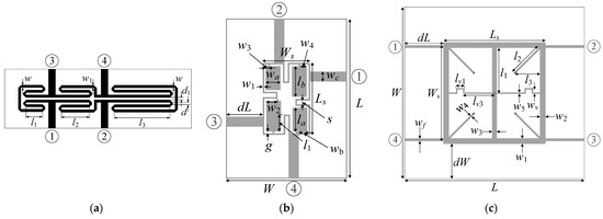 Microwave structures employed for validation of the proposed design centering algorithm: (a) compact rat-race coupler (Circuit I) [40], (b) miniaturized branch-line coupler (Circuit II) [41], (c) dual-band branch-line coupler (Circuit III) [42].