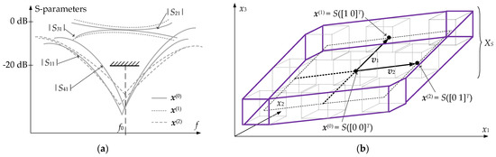 Yield optimization using performance-driven surrogate modeling concept [45]: (a) S-parameters of a microwave coupler at the nominal design x(0), design x(1) (spoiled power split), and design x(2) (improved −20 dB bandwidth); only the selected S-parameters are shown for x(1) (|S21|, |S31|) and x(2) (|S11|, |S41|) for clarity. The designs x(1) and x(2) determine the important directions from the point of view of yield manipulation; (b) Designs x(0), x(1), and x(2) form surface S(t) parameterized by vector t = [t1 t2]T. The union of intervals SI(t) for −1 ≤ t1, t2 ≤ 1 becomes the domain XS of the surrogate model.