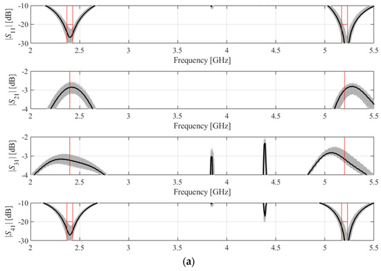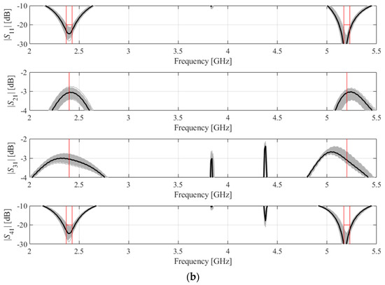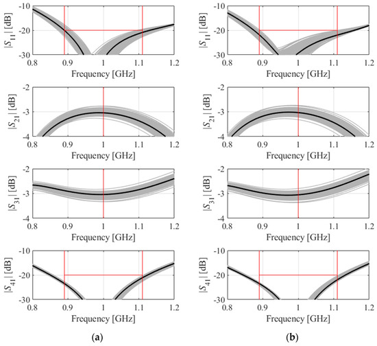 For simplicity of notation, whenever |Sj1(x,f)| is used, it is understood as dB-valued entity. In particular, the left-hand sides of Equations (1)–(3) contain logarithms of the respective circuit responses, whereas the entities of the right-hand sides of the said equations (i.e., the threshold Smax, and the power split error Dk) are also expressed in dB. Here, Smax is the acceptance threshold for the matching and isolation characteristics, e.g., Smax = −20 dB. The scattering parameters in (1)–(3) are marked as explicitly dependent on parameters x and frequency f. If the aforementioned conditions are satisfied, the circuit features a sufficient bandwidth (at the Smax level) and realizes a required power split (within the assumed tolerances Dk) at all operating frequencies simultaneously.