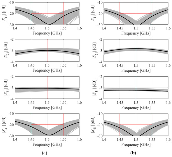 EM-driven Monte Carlo simulation of Circuit III (Figure 3c) at (a) the nominal design, and (b) the final design obtained using the proposed algorithm. MC carried out using 500 random samples. EM simulation data shown as gray curves. Black plots show the circuit responses at the nominal (a) and the optimized design (b).