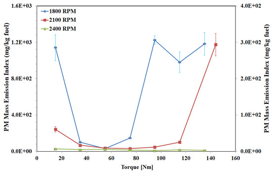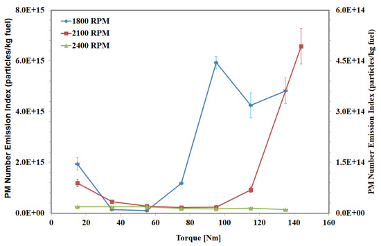 The average PM number emission indices (EIN) and their associated error bars were calculated from EEPS data, as provided in Figure 1, for the different rotation speed. The average EIN for 1800 rpm decreased from 1.9 × 1015 to 9.3 × 1013 particles per kilogram of fuel as the engine torque increased from 15 to 55 Nm. From a 55 Nm average, EIN increased to 5.9 × 1015 for 95 Nm, which was the highest EIN for 1800 rpm. The figure shows that, in comparison to the other rotation speeds, 1800 rpm had the highest EIN values over the entire range of engine torque. For 2100 rpm rotation speed, EIN values decreased from 8.9 × 1013 to 6.8 × 1013 particles per kilogram of fuel as the engine torque increased from 15 to 115 Nm. About torque equal to 144 Nm regeneration of DPF (diesel particulate filter) has become. It caused an increase of EIN value from 6.9 × 1013 to 4.9 × 1014 particles per kilogram as the engine torque increased from 115 to 144 Nm. The average EIN for 2400 rpm is after regeneration of DPF; thus, the average values of particles per kilogram of fuel are significantly lower than for 1800 and 2100 rpm. The values of EIN decreased from 1.9 × 1013 to 1.0 × 1013 as the engine torque increased from 15 to 135 Nm.