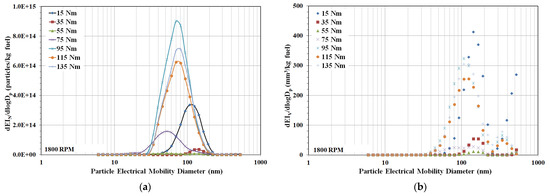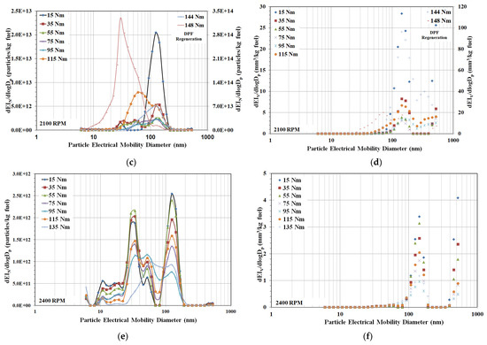 The data recorded by the EEPS was averaged for the same engine torque and then converted to differential number-based (dEIN/dlogDp) and differential volume-based (dEIV/dlogDp) particle size distributions. Figure 3 represents example plots of dEIN/dlogDp and dEIV/dlogDp under different engine torques for rotation speed 1800 rpm (Figure 3a,b), 2100 rpm (Figure 3c,d), and for 2400 rpm (Figure 3e,f).