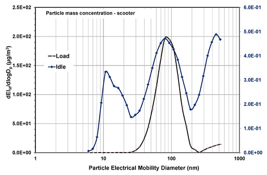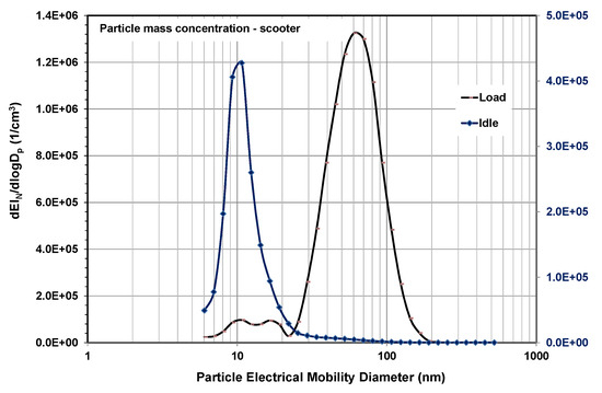 Figure 4, Figure 5 and Figure 6 show the measurements results of particulate matter from the scooter in two phases: idling and under an average load on a chassis dynamometer. Figure 4 shows the dimensional distribution of particles. During idling, particles with a diameter of about 10 nm dominate, reaching the maximum value of 4.5 × 105. The engine load caused the dimensional distribution to shift to the right, towards larger particles. Thus, the dominant diameter is approximately 80 nm. In addition to increasing the mean particle size, an increase in the concentration of the particles number was noted, reaching 1.3 × 106 for the diameter dominating in the distribution.