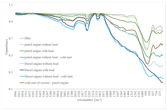 All adsorbed PMs collected from both engines (Diesel and petrol) possess carbon black: a baseline sloping down to the right (%T display) as carbon black displays absorption over the entire region from 4000 to 400 cm−1, and, when using the ATR technique, the effect of carbon black becomes greater, with deeper light penetration at the long wavelength (low wavenumber) end. The largest amount of carbon black is present at PMs emitted from Diesel engine, both working with and without load and during cold start. Slightly less carbon black is emitted in the case of an engine without load than with load. There are no evidence signals from alkanes or aromatic compounds; however, the weak signals at ~2900 cm−1 at the range 1650–1400 cm−1 might be seen. It is larger for PM from the Diesel engine than petrol engine. The signals at ~2300 cm−1 and ~2100 cm−1 can be from nitryl compounds or alkanes, and they are stronger in the case of PMs from the Diesel engine than petrol engine. During the cold start of engine, more carbon black is emitted that is stronger for the Diesel engine than petrol engine. To summarize, the PMs from different engines, and working under the different conditions, emitted PMs that differ in the chemical composition.