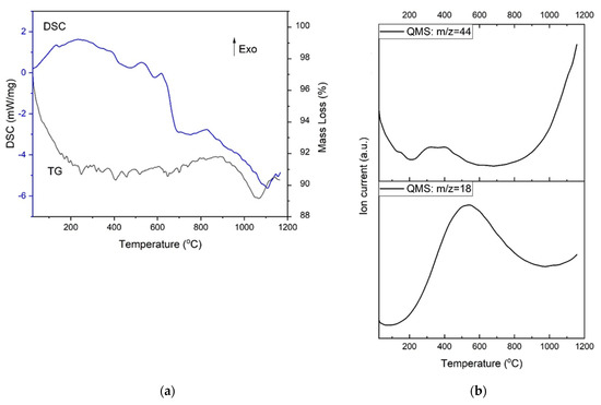 The results for petrol engine are shown in Figure 9. From the room temperature up to approximately 600 °C, exothermic combustion of the filter is visible (Figure 9a). This process is associated with ~8 wt.% mass loss and release of some organic compound/s (C2H2S or C2H5CHNH2 (m/z = 58) and water (Table 2)).