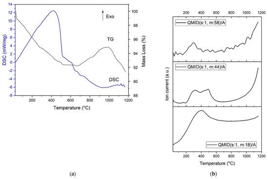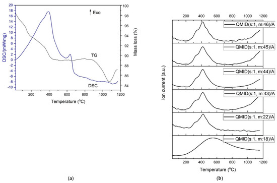 EGA results for the pure filter, where: (a) presents DSC-TG signals, and (b) shows QMS registered signals.
