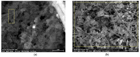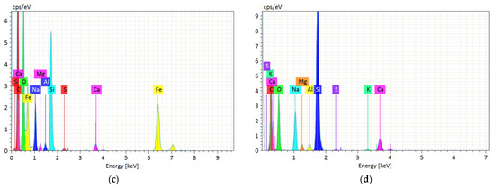 More in-depth information was obtained using SEM-EDS that makes it possible to study the elementary analysis of the PM. Figure 11 shows morphology of the PM for diesel end petrol engines. It can be seen that particles deposited on the Diesel engine fibers are smaller, and their amount is lower (Figure 11a,b) than in case of petrol engine (Figure 11c,d). PM from the petrol engine showed more agglomerations. SEM observations in AsB mode showed different weight of the collected contaminations (heavier particles shines). EDS analysis described below reveals that shining objects are iron particles.