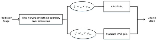 - Correction: The correction gain is obtained and, the estimated states are then updated from their a-priori into their a-posteriori by using this gain.where S is the innovation covariance matrix, E is the combination of measurement error vector, is the SVSF convergence parameter and is the SVSF smoothing boundary layer width.The SVSF is a predictor-corrector method and its gain is employed to update the a-priori estimated states. The gain is as follows,where is upper limit for the boundary layer. For the case when the SVSF gain is:Finally, the a posteriori parameters are calculated as:where is called the filter measurement residual sequence. Equations (14) to (26) summarize the SVSF-VBL strategy.