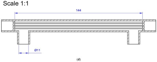 This paper presents the results of experimental tests performed using a shell and tube mini heat exchanger (STMHE). A schematic drawing of the analysed heat exchanger is shown in Figure 1. It consisted of seven brass tubes with outer diameter of , inner diameter of , and length of . The tubes were arranged in a hexagonal arrangement, and the tube pitch was equal to . The thermal conductivity coefficient of brass was assumed to be [20]. The tube sheet was made of thick copper sheet. The exchanger shell was made of copper and had an internal diameter equal to . All elements of the STMHE were connected by means of brazing. The heat exchanger was insulated along its entire length with an insulation layer made of polyurethane foam.