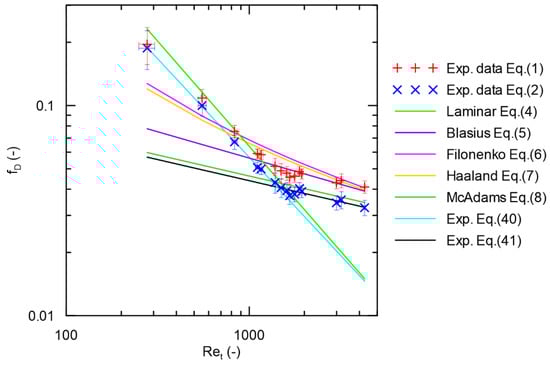 The experimental values of the Darcy friction factor without the influence of the inlet and outlet minor loss coefficients were calculated according to Equation (1), and then accounting for the influence of the tubes inlet and outlet using Equation (2).
