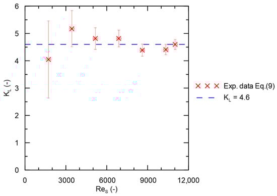 For flow in the shell side the minor loss coefficients were determined according to Equation (9). For turbulent flow in ducts of complex shape it is usually assumed that the coefficients of frictional resistance are determined from classical correlations for circular ducts; however, when calculating the Reynolds number, the equivalent diameter is taken as the diameter of the duct, and the same was done in this case. For turbulent flow in a hydraulically smooth pipe, the values of the Darcy friction factor calculated using different correlations practically do not differ significantly from each other. For this reason, to simplify the calculations, it was assumed that the Darcy friction factor can be determined using the Blasius equation of Equation (5) [28]. The results of the calculations are shown in Figure 3. It can be seen that, after taking into account the measurement uncertainties, the value of the local resistance coefficient is practically constant and is, on average, . However, it should be noted that the determined minor loss coefficient includes four components: the change in flow direction at the inlet to the shell side, the spreading of the liquid stream between the tubes, the recombination of smaller streams into one larger one, and the second sudden change in flow direction at the outlet of the shell side.
