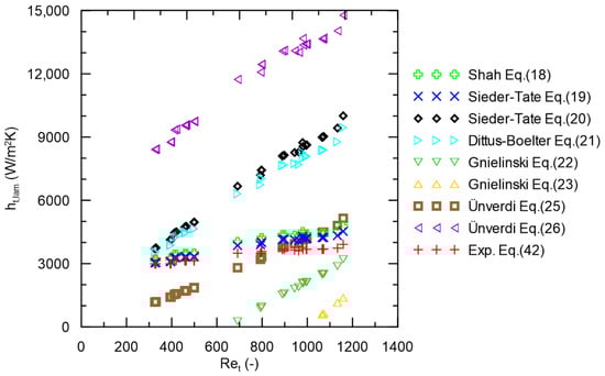Figure 4 shows the dependence of the heat transfer coefficient from the tube side on the Reynolds number for laminar flow. The figure compares the experimentally obtained correlation of Equation (42) with all the correlations for tube flow, both for laminar (Equations (18) and (19)) and turbulent (Equations (20)–(26)) flow. It can be seen that the slope of the calculated heat transfer coefficients for turbulent flow is much steeper than that for the correlations for laminar flow. The experimental results most closely match those obtained from the Sieder–Tate correlation for laminar flow (Equation (19)); however, it gives slightly underestimated results compared to the correlation of Equation (42).