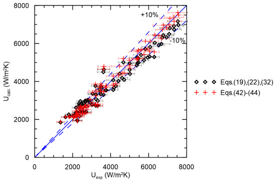 The experiments performed did not allow experimental values of heat transfer coefficients to be determined, so we cannot directly compare the experimental and calculated values of heat transfer coefficients. However, it is possible to determine the overall heat transfer coefficient values and compare them with the experimental values. Such a comparison is shown in Figure 7. There are two series of data: one represents the overall heat transfer coefficient calculated using the correlations determined experimentally in this study (Equations (42)–(44)), whereas the other represents the results obtained using the literature correlations for which the determined values of heat transfer coefficients match best to the results determined using the experimental correlations determined in this work (Equations (42)–(44)), i.e., the Sieder–Tate correlation for laminar flow inside pipes (Equation (19)), the Gnielinski correlation for transitional and turbulent flow inside pipes (Equation (22)), and the Kozioł correlation for flow along a pipe bundle (Equation (32)). The solid line indicates the diagonal of the diagram, i.e., the zone where the calculated results perfectly coincide with the experimental results. The dashed lines indicate the ±10% deviation from the diagonal. Taking into account the measurement uncertainties, we can see that in both cases a good agreement between the calculated results and the experimental results was achieved. Most of the calculated results do not deviate from the experimental results by more than 10%.