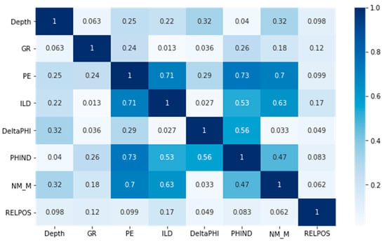 A heat map is often used in practice to display the correlation coefficient matrix of a set of variables [33]. This also has great applicability in displaying the data distribution of the contingency table. Through heat mapping, we can intuitively feel the difference in value size. Figure 5 is a heat map of the above seven logging attributes, as well as depth. The right side of Figure 5 is the color bar, which represents the mapping from value to color. A value from small to large corresponds to the color from light to dark. From the heat map in Figure 5, we can see that the correlation of the photoelectric effect curve (PE) is the best, with the correlation between photoelectric effect (PE) and average of neutron and density logs (PNHIND) being 0.73, the correlation between photoelectric effect (PE) and resistivity (ILD) being 0.71, and the correlation between photoelectric effect (PE) and nonmarine–marine indicator (NM_M) being 0.7. The photoelectric effect is usually included in modern well logs to provide essential information on formation lithology. However, many legacy wells might not have photoelectric effect logs. Therefore, the photoelectric effect was selected as the target curve in this study, and the remaining six attributes were used as the known characteristic values.
