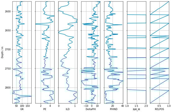 Complete well-logging curve of Well 1. GR: gamma ray, PE: photoelectric effect, ILD: resistivity, DeltaPHI: neutron density–porosity difference, PHIND: average of neutron and density logs, NM_M: nonmarine–marine indicator, RELPOS: relative position.