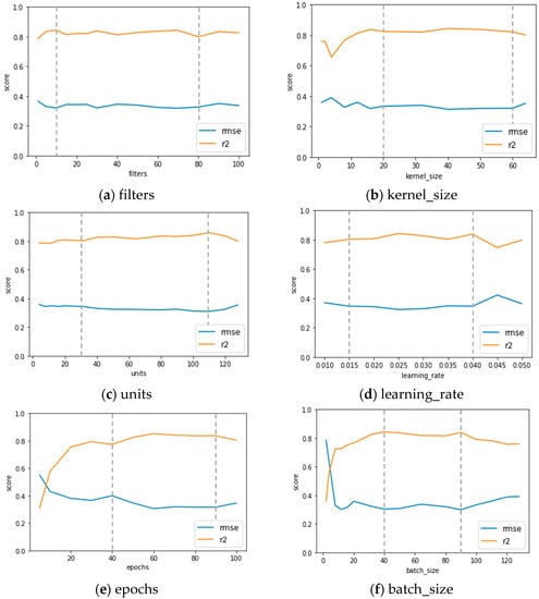 There are seven main hyperparameters in the CNN-LSTM hybrid network model, including filters (the number of CNN filters), kernel_size (the size of the CNN convolutional kernel), units (the number of LSTM hidden neurons), learning_rate (the learning rate of the neural network), epochs (the number of samples trained), batch_size (the size of each batch of data), and number of iterations (the number of times the training data are trained using the network model), which need to be calibrated and determined during PSO iterations. The first step is to analyze the impact of each hyperparameter on the prediction accuracy, and then the analysis result is used to determine the reasonable range of hyperparameters for performing the PSO.