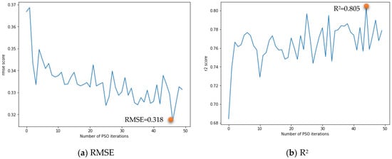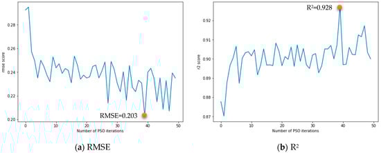 The seven hyperparameters of the CNN-LSTM hybrid network model were selected as the tuning parameters of PSO, and the range of each hyperparameter was finalized according to the results of single-factor analysis. The PSO had a total of 50 iterations with 15 particles each. Figure 8 shows the distribution of the optimal RMSE and R2 for each PSO iteration. As the number of iterations increased, the optimal RMSE showed a decreasing trend and the optimal R2 showed an increasing trend, indicating that the training effect of the proposed model was getting better and tended towards the global optimum value. The hyperparameters of the optimal CNN-LSTM model with the best evaluation metrics after PSO were then obtained and are listed in Table 2. The RMSE of the optimal CNN-LSTM model was 0.203, which is 19% lower than that before the performance of PSO (RMSE = 0.252), and the R2 was 0.928, which is 4.9% higher than that before the performance of PSO (R2 = 0.885). This means that the optimal CNN-LSTM hybrid network model constructed with the seven hyperparameters determined by the PSO algorithm can greatly improve the accuracy of the CNN-LSTM model.