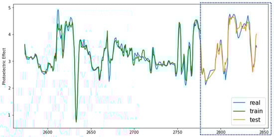 The model with the best prediction was saved through several iterations of the CNN-LSTM-PSO model, and the saved model was used to make predictions for the single-well test data. Figure 9 shows the photoelectric effect curve-matching result for Well 1, where the true value is shown in blue, the predicted photoelectric effect curve of the training data set is shown in green, and the predicted photoelectric effect curve of the test data set is shown in orange. The result shows that the predicted photoelectric effect curves, on both the training and test sets, agreed well with the field logging data.