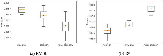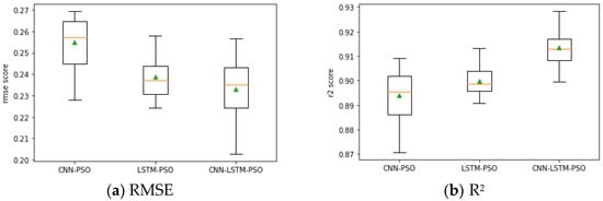Comparison of the RMSE and R2 of CNN, LSTM, and CNN-LSTM after PSO.