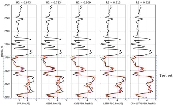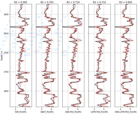 Figure 11 shows the photoelectric effect curves predicted by the SVR, GBDT, CNN-PSO, LSTM-PSO, and CNN-LSTM-PSO models from other logs of Well 1 test data, where black is the actual measured photoelectric effect curve in the oilfield and red is the prediction result on the 20% test set. Overall, there was a good overlay between the measured photoelectric effect and the predicted photoelectric effect for all five models. The R2 values of all models ranged from 0.643 to 0.928, indicating that deep learning can accurately predict the trend of the target photoelectric effect curve. However, combining CNN, LSTM, and PSO algorithms was chosen as the best model, as the logging prediction accuracy is significantly improved in this arrangement, and it is more suitable for predicting the photoelectric effect curve. Therefore, the CNN-LSTM-PSO model was proven to be useful for predicting logging curve sequences from other well logs of the target well itself.