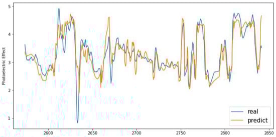 The prediction performance of the CNN-LSTM model optimized by the PSO algorithm was then verified by predicting the photoelectric effect curve of Well 1 on test data sets. Figure 13 shows both the actual measured photoelectric effect curve of Well 1 and the photoelectric effect curve of Well 1 predicted by the CNN-LSTM-PSO model with logs from adjacent wells. The blue curve is the test photoelectric effect data of Well 1, and the orange curve is the photoelectric effect curves of Well 1 estimated by the CNN-LSTM-PSO model with adjacent well information. It is obvious that the photoelectric effect curve predicted by the CNN-LSTM-PSO hybrid network model agrees well with the measured photoelectric effect curve from the test data.