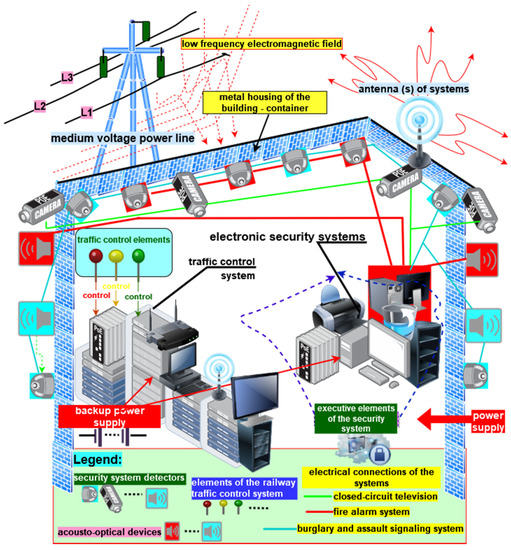 Transport telematics systems and electronic security systems (ESS) located in a metal container on a railway route are considered to be the “State’s critical infrastructure items” [,,]. Their most important task is to ensure the security of vehicle movement on railway routes [,]. They are located in a special, structurally reinforced metal container and are protected against the action of external and internal destructive factors. ESS elements can also be found inside buildings and in a publicly available external environment, where they are exposed to variable environmental parameters—temperature [], humidity, etc., as well as the unintentional low-frequency electromagnetic field generated by medium voltage—15, 30 kV—power lines. These lines are a supply source for the aforementioned systems (Figure 1) [].