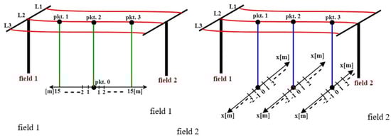 The study was conducted for two medium-voltage (15 kV and 30 kV) power lines that supplied a metal container housing transport telematics systems and electronic security systems. The aforementioned containers were located near a railway communication route; however, the significant distance (over 250 m) from the overhead contact line allowed the authors to discard unintentional, nonstationary electromagnetic interference generated by the moving electric locomotives [,]. Operating electrical or electronic devices that are powered by electricity leads to generating electromagnetic, electric, or magnetic fields. A field generated artificially, intentionally or unintentionally by humans, deforms the natural electromagnetic environment. Most often, humans encounter in their nearest surroundings (their workplace or residence) unintentional electromagnetic radiation sources that are primarily of the low-frequency range. Power transmission lines are one of the main sources of unintentional electromagnetic radiation. Due to their coverage (overhead lines in particular), they emit electromagnetic radiation over a large area. Two frequency subranges for field meters were introduced in the measurement methodology involving the issues associated with diagnosing low-frequency electromagnetic fields, e.g., sources with a frequency of 50 Hz that are generated by power lines. The first range included extremely low frequencies (ELF)—from 5 Hz to 2 kHz, while the second involved very low frequencies (VLG)—from 2 kHz to 100 kHz. The space around the medium-voltage lines was diagnosed within these frequencies, pursuant to the applicable regulations on the measurement methodology. In order to investigate the impact of medium-voltage lines on the electromagnetic environment inside and outside the container with installed transport telematics systems, the authors measured the distribution of electromagnetic field components under three power lines supplying technical facilities, i.e., a 30 kV line and two different 15 kV lines. The measurements were taken at a positive outside temperature 20–21 °C and humidity 38–42%. The so-called “electromagnetic field background measurements” were conducted prior to commencing the measurements covering the electromagnetic field generated by the studied power lines. They were taken in places where the natural electromagnetic field of the Earth is undistorted. The results are listed in Table 1.