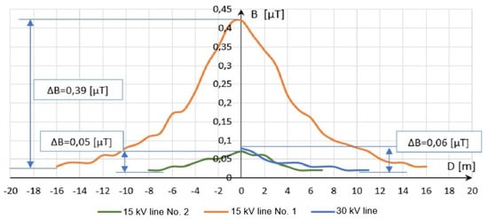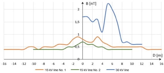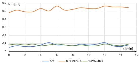 Changes in the magnetic field induction B over time were also measured. The measurements were taken in the location where the highest values were recorded. The magnetic field induction B value was read every minute for 15 min. Measurement results are shown in Figure 10. On comparing the magnetic field induction B values obtained over time, it can be concluded that they remained on average at a constant level. It was 0.53 μT for the 15 kV line No. 1 and 0.08 μT for the 30 kV and 15 kV No. 2 lines.