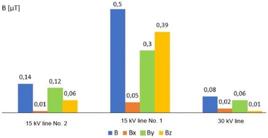 The presented characteristic curve (Figure 3) shows a significant decline in magnetic field induction B with increased distance from the studied lines. Magnetic field induction B reaches a field background level at a distance of 17–19 m from point 0 in the case of the 15 kV power line No. 1, whereas, for the 15 kV power line No. 2 and the 30 kV line, this distance is 7–9 m from point 0, with the measurement conducted in accordance with Figure 2. Disproportions between the maximum and minimum magnetic field induction B, depending on the measurement location, can be noticed when analyzing the resulting distribution. According to the Biot–Savart law, magnetic field induction B is proportional to the value of the flowing current and inversely proportional to the distance of the measuring point from the field source. Higher voltage of a transmission line supplying a container does not necessarily mean the presence of higher magnetic field induction B values. This is confirmed by the characteristic curves in Figure 3. The values of magnetic field induction B components Bx, By, and Bz are shown in Figure 4 for measuring point No. 2 (Figure 2), due to the fact that it provided the highest magnetic field induction B values.
