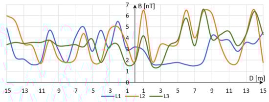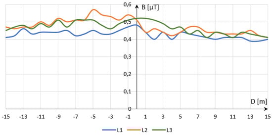 The maximum magnetic field induction B for the VLF range under the 30 kV line was 2.2 nT, which was achieved at a distance of 5 m from point 0 (measurement in accordance to Figure 2). In contrast, the maximum magnetic field induction B was 0.9 nT for 15 kV line No. 1 and 0.7 nT for 15 kV line No. 2. Figure 6 and Figure 7 show the measurement of magnetic induction along phase conductors of the container supply lines for the ELF range and two supply voltages—15 and 30 kV. The measurement procedure is shown in Figure 2.