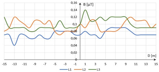 Distribution of magnetic field induction B along L1, L2, L3 phase conductors of the 15 kV power line No. 1, ELF frequency range.
