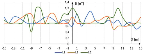 The maximum magnetic field induction B measured along the phase conductors for the ELF range was identified under the central L2 conductor of the 15 kV line No. 1 and amounted to 0.57 μT, while the value under the 30 kV line was equal to 0.14 μT. Figure 8 and Figure 9 show the magnetic field induction B along phase conductors for the VLF phase (measurement methodology shown in Figure 2). Upon observing the changes in the magnetic field induction B along the phase conductors over the VLF range, it can be noted that the 30 kV supplying the container was distinguished by higher values relative to both 15 kV lines. There were also significant differences between the maximum and minimum magnetic field induction B value depending on the rated voltage of the line supplying the container with telematics and security systems.