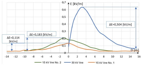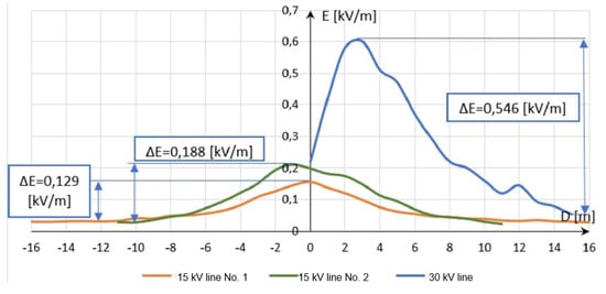 Electric field strength E decreased with increasing distance from point 0 and reached a background value at a distance of 11–13 m for the 15 kV power line and 15–16 m for the 30 kV line. As in the case of the magnetic field induction B, the electric field strength E also reached the highest values at measuring point No. 2. The 30 kV power line, however, achieved significantly higher electric field strength E values. Along with the increase of the line voltage, the electric field strength E also increased.