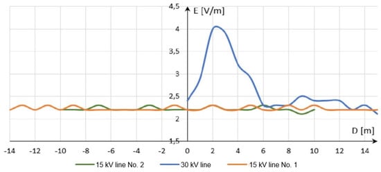 In the course of analyzing the characteristic curves, it can be concluded that 15 kV lines produced virtually no electric field strength E component over the VLF range. The changes in the values over the entire measuring range fluctuated from 2.1 to 2.3 V/m, which corresponded to the values of the measured electric field background. The changes in the electric field strength E along the phase conductors of container-supplying MV power lines were also analyzed. The results of these tests are shown in Figure 14 and Figure 15.