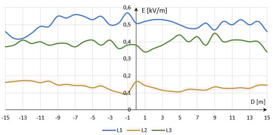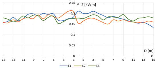 Distribution of electric field strength E along L1, L2, L3 phase conductors of the 15 kV container power line, ELF frequency range (measurement methodology as in Figure 2).