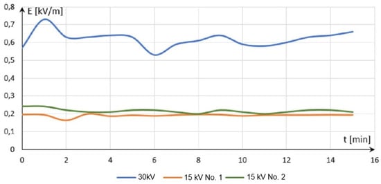 Figure 16 shows changes in the electric field strength E under MV lines supplying the container, for the ELF range. In the case of both 15 kV lines, the electric field strength could be considered constant, and its mean value was 0.19 kV/m and 0.21 kV/m for 15 kV lines No. 1 and No. 2, respectively. In the case of the 30 kV line, the electric field strength ranged from 0.53 kV/m to 0.73 kV/m.