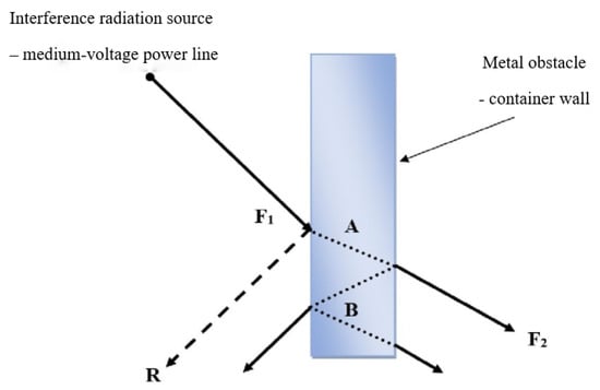 Principle of shielding an electromagnetic wave generated by an MV power line through a metal obstacle constituting the container.