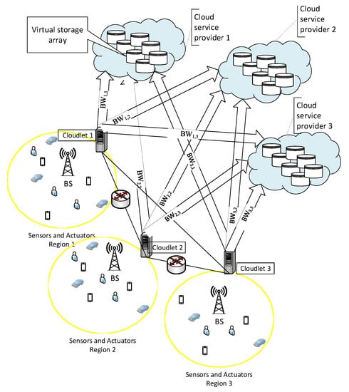 The system model consists of different parts, as illustrated in Figure 1. Storing data as fast as possible by consuming less energy is critical. The first cloudlets are assumed as the first sub-layer in the presented model. Neighbor cloudlets are considered as a second sub-layer in the model. To accomplish the processing of data as quickly as possible, the distribution of data among different cloudlets is adopted to avoid overload. Using the distributed model is not only limited to failure in service allocation but also reduces energy consumption. The reliability of the system is reduced by rejecting a request from different users. Furthermore, rejecting requests destroys the service level agreement. The distribution of data among various services increases the availability of services due to more available free space. The availability of different services is one of the QoS factors. Therefore, the distribution of data among different services satisfies the QoS. By distributing data among services, failure in one service does not lead to loss of all data [].