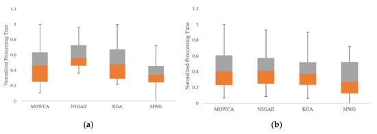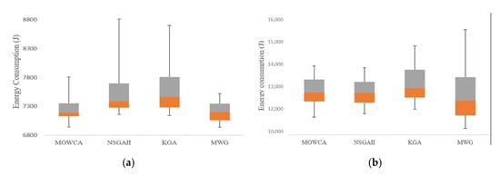In Figure 3, the distribution of different solutions’ energy consumption in the Pareto of various algorithms is shown. Based on Figure 3, the percentage of the resultant solutions, which have a minimum energy consumption from MWG, is more in comparison to the other algorithms’ result. Thus, it gives us more options in selecting the best solution that satisfies other objectives (e.g., processing time, load balancing). Meanwhile, the resultant solution from MWG has a minimum energy consumption in comparison to the other algorithms’ result.