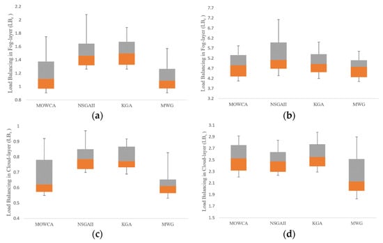 Comparison between algorithms due to the distribution of different solutions’ load balancing in the resulted Pareto after 100 iterations for (a) 100 data items in the fog layer, (b) 400 data items in the fog layer, (c) 100 data items in the cloud layer, and (d) 400 data items in the cloud layer.