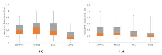 On the other hand, many services such Dropbox, after processing data, outsource data to cloud storage services for storing. Service providers around the world provide a variety of services for users. The throughput of different service providers varies. Therefore, the needed time to outsource data to cloud services varies based on available bandwidth. Figure 6 shows the distribution of different solutions’ transmission time in the Pareto of various algorithms. Based on Figure 6, the percentage of the resultant solutions that have a minimum transmission time from MWG are more in comparison to the other algorithms’ result. Therefore, it gives us more options in selecting the best solution that satisfies other objectives (e.g., processing time, load balancing). Meanwhile, the resultant solution from MWG has a minimum transmission time in comparison to the other algorithms’ result.