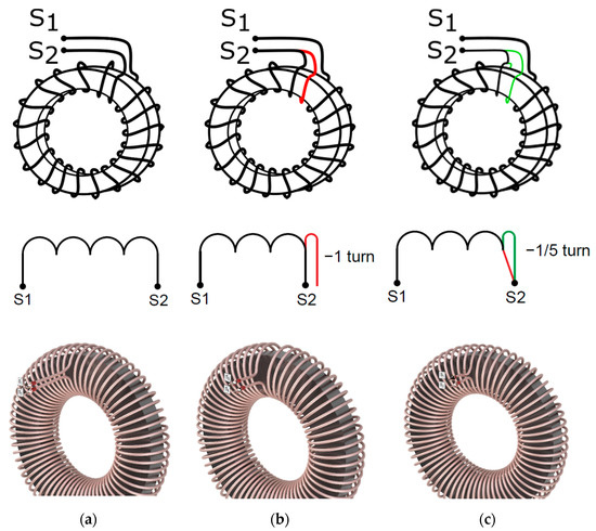 The secondary winding of the window-type CT without correction (a), with single turn correction (b) and with fractional correction of turns (c).