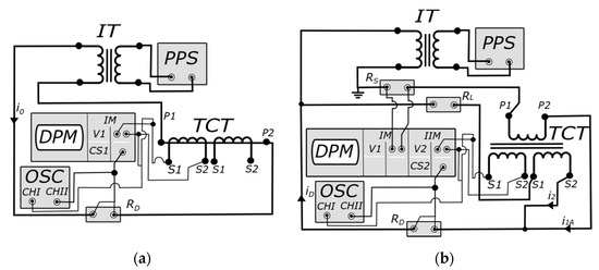 Measuring systems to determine the magnetization curves and the active power losses of the CT: (a) non-load state, (b) load state.