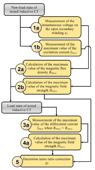 In the presented measuring system in Figure 2a, the magnetization curve, the active power losses and the maximum value of the magnetic core excitation current I0m (in the non-load state, it is the primary current of the TCT) are measured. Moreover, it is also mandatory to measure the instantaneous voltage on the secondary winding, which corresponds in this case to the value of the voltage of the magnetic core on the mutual inductance of the windings. The flowchart showing the steps of the procedure to determine the turns ratio correction of the CT is presented in Figure 3.
