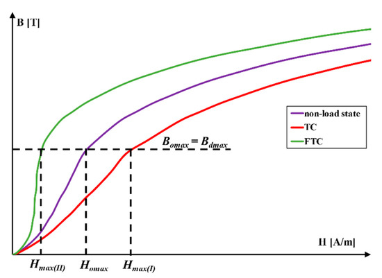The equivalent magnetization curves in the load state of the secondary winding of the TCT for the same value of the magnetic flux density may achieve different values of the magnetic field strength equal to Hmax(II) or Hmax(I) depending on the applied value of the turns ratio correction. If the value of the differential current Idmax is decreased in relation to the measured magnetic core excitation current I0m, then for the condition B0max = Bdmax, a lower value of the magnetic field strength is achieved (Figure 5, Hmax(II)). In this case, the correction of the number of turns of the secondary winding is made correctly. Otherwise, when the application of the turns ratio correction increases the maximum value of the differential current Idmax, then for the condition B0max = Bdmax, a higher value of the magnetic field strength Hmax(I) is achieved.