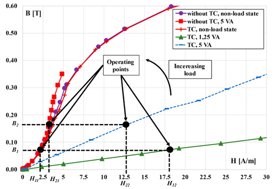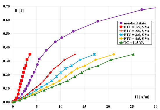 In Figure 4, the magnetization curve of the inductive CT’s magnetic core determined in the non-load state (purple line) and the equivalent magnetization curves determined in the load state of the secondary winding (red and green lines) are presented.
