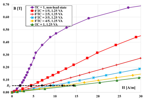 Application of the developed method enables the possibility to determine the turns ratio correction of the inductive CT. The magnetization curves determined in the load and non-load state are used. If the magnetic flux density is equal to 0.05 T (B3), for the primary current equal to 6 A, the maximum value of the excitation current is equal to 6.447 mA. Using relation (5) for these values, it is possible to determine the number of turns of the applied winding correction from the magnetization curves presented in Figure 6: