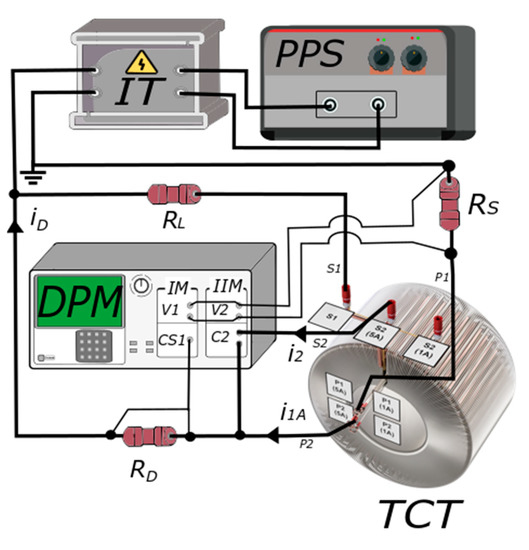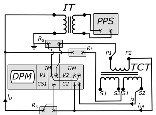 To determine the values of current error and phase displacement of the CT, it is required that the test system is capable of generating currents with the required high RMS values or other applications of alternative developed measurement methods [14,15,17,18,19,20,21]. Considering the window-type CT, it is possible to use the method based on its ampere-turns condition, where the additional winding with the number of turns resulting from the rated current ratio is winded. Therefore, the tested CT is supplied with the primary current equal to the value of its secondary current [20]. However, to test the CTs transformation accuracy for distorted currents, the power source capable of generating distorted currents with programmable levels of higher harmonics is required [17,22]. Calibration of the CT during the transformation of a sinusoidal current 50/60 Hz requires utilization of the reference CT and currents comparator connected to their secondary windings [23,24]. Other methods to determine the accuracy of tested CTs are based on measuring systems using the Rogowski coil or the current transducer made with flux-gate technology [15,25,26]. These systems may use the transducer with a digital signal proportional to the current error and phase displacement [27]. Such devices use a dual-band A/D converter and keep the accuracy over a wide frequency range. The values of current error and phase displacement of harmonic transformation by the tested CTs may be determined using a two-channel measurement card [28,29].