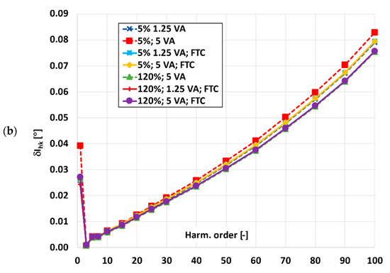 Using the Cosine Theorem from determined values of the I1Ahk, IDhk and the value of the phase angle between the hk harmonic of these currents, it is possible to determine the rms value of the given harmonic of the secondary distorted current I2hk of the TCT [20]. Then, the value of the current error of a given harmonic transformation is determined from the following equation: